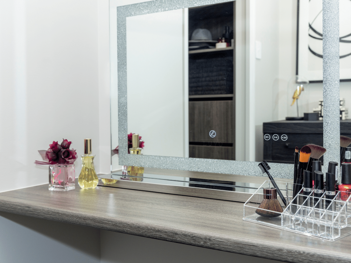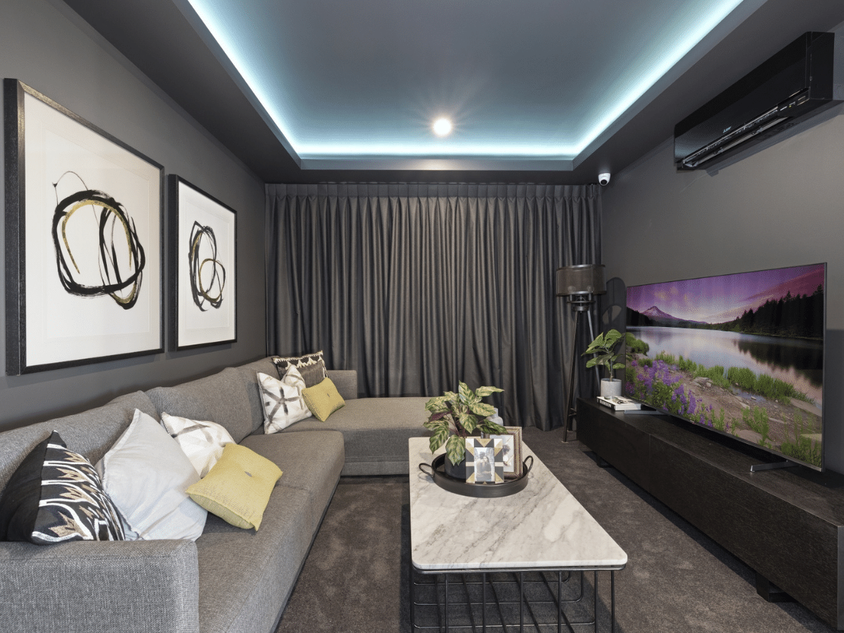 Other Zones in the home include the Lounge/Theatre room. Dark coloured walls and ceiling and plush carpeted floors, create the perfect dark and cosy home theatre. To add a further touch of luxury, we have included voice activated self-opening/closing block-out curtains. In “The Flynn” display home, we have utilized a high quality multi-leaf door system that allows us to also open this room right up to the main the living area to further enhance the feeling of space.
