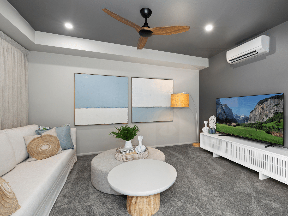 This space is cleverly positioned behind the kitchen, out of the way, but still close enough for Mum to keep an eye on how they are playing together and what they are watching. It is also connected to the kid’s bathroom and their bedrooms which are towards the back of the home, all nicely separated from the other zones.